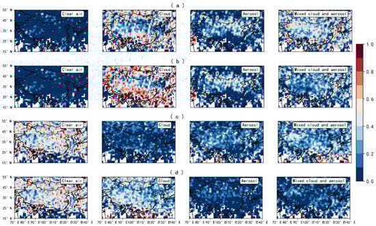 Figure 11 compares the geographical distribution of cloud–aerosol identified using the U-Net model in the spring of 2019 (Figure 11a,c) with that of the CALIOP classification algorithm (Figure 11b,d). It is important to note that “Clear air” indicates the absence of clouds and aerosols in the vertical atmosphere, “Cloud” signifies the presence of only clouds without aerosols in the vertical atmosphere, “Aerosol” denotes the presence of only aerosols without clouds in the vertical atmosphere, and “Mixed cloud and aerosol” indicates the simultaneous presence of both clouds and aerosols in the vertical atmosphere. The “Clear air” category does not involve model predictions; it is included here for better visualization of the cloud–aerosol spatial-distribution ratio. The research previously attempted to compare CloudSat cloud products and the monthly average Aerosol Optical Depth in MIRA2, as shown in Figures S2 and S3.