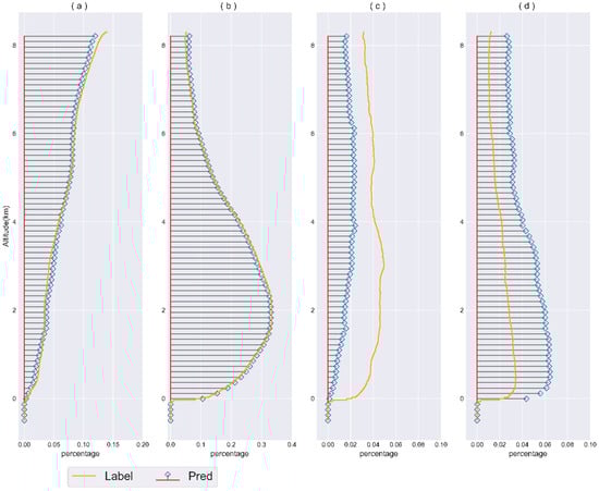 Vertical distribution of cloud–aerosol samples from the spring of 2019. This figure primarily illustrates the comparison between the results of the U-Net model and CALIPSO products in the vertical atmospheric profiles. (a) Cloud frequency comparisons for high-quality data; (b) Aerosol frequency comparisons for high-quality data; (c) Cloud frequency comparisons for medium- and low-quality data; (d) Aerosol frequency comparisons for medium- and low-quality data. In practical applications, although the proportions of atmospheric features and land cover were considered, they are not explicitly shown in the figure as they do not impact the cloud–aerosol frequency comparisons.