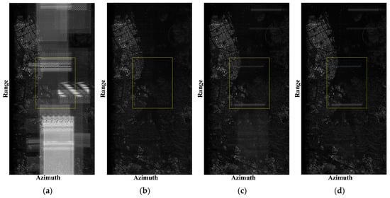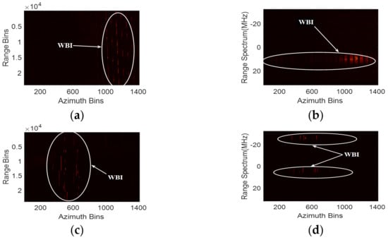 The real measured SAR data corrupted with WBI recorded by Sentinel-1 in (a,c) range-time/azimuth-time domain and (b,d) range–frequency azimuth-time domain.