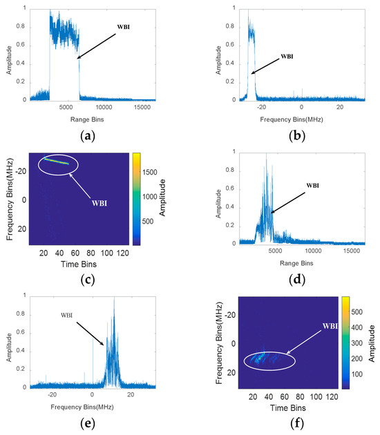 WBI-contaminated SAR echoes in (a,b) range time, (d,e) range–frequency, and (c,f) range TFD.