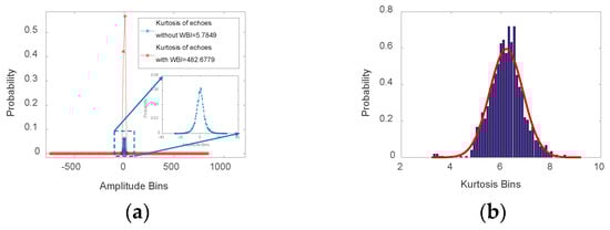 Illustration of (a) statistical comparison of WBI-free instantaneous spectrum and WBI-corrupted instantaneous spectrum and (b) histogram of WBI-free SAR echoes’ kurtosis with a distribution fit.