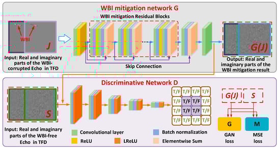 The generative adversarial network (GAN) is an emerging generative framework that draws inspiration from the zero-sum game theory. It is composed of a generative network and a discriminative network. The generative network acquires knowledge from real-world examples and produces fabricated samples, whereas the discriminative network assesses the genuineness of the samples. Throughout the training procedure, the generator consistently enhances the authenticity of the counterfeit samples that are produced. At the same time, the discriminatory network imposes penalties on the produced samples, thereby compelling the generative network to generate samples of superior quality. In this way, the GAN can consistently diminish the statistical disparity between the generated and authentic samples. As a result, the WBIM-GAN is composed by a network for mitigating WBI and a network for discriminating WBI. The is employed to reduce WBI and produce the SAR echo without WBI. At the same time, the is employed to differentiate the accuracy of the WBI mitigated SAR echo produced by the . The utilizes the integration of the deep residual network to enhance the effectiveness of WBI mitigation while solving the gradient saturation problem in the deeper layers. Meanwhile, it employs the PatchGAN framework to capture the local details and statistical characteristics of the target echoes, thereby augmenting the effectiveness of WBI mitigation.