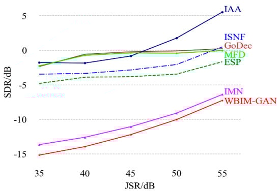 Figure 8 depicts the WBI mitigation results of WBIM-GAN performed on the validation set. It is obvious that the WBIM-GAN can effectively mitigate WBI. Figure 9 shows the training loss curves of IMN and WBIM-GAN with training iterations. It is evident that WBIM-GAN exhibits superior interference mitigation capabilities compared to IMN. To further confirm the efficiency of WBIM-GAN, we analyze the performance of different WBI mitigation algorithms under different jam-to-signal ratios (JSRs). Comparative WBI mitigation algorithms include GoDec, instantaneous-spectrum notch filtering (ISNF), Eigenspace projection (ESP), the iterative adaptive approach (IAA), matrix factorization decomposition (MFD), IMN, and WBIM-GAN. Figure 10 depicts the SDR curves of the seven above WBI mitigation methods when the JSR is set to 35 dB, 40 dB, 45 dB, 50 dB, and 55 dB. As can be seen, the data-driven WBI mitigation methods have a better performance. Meanwhile, the WBIM-GAN exhibits a superior performance in regard to mitigating WBI, and it should be emphasized that the SAR echoes recovered using the suggested approach have the lowest SDR compared to all the aforementioned methods for WBI mitigation. To further demonstrate the effectiveness of WBIM-GAN, we analyze the time–frequency distribution by using different WBI mitigation methods when the JSR is set to 50 dB, and the WBI mitigation results are represented in Figure 11. It is evident that the model-driven WBI mitigation methods can effectively mitigate WBI, but they cause significant distortion of the target signal. However, the IMN and WBIM-GAN can mitigate WBI and recover the target signal effectively. Simultaneously, the compared SDR and the WBI mitigation results demonstrate that the performance of WBIM-GAN is the best. Moreover, Figure 12 shows the class activation maps of the IMN and WBIM-GAN. It can be seen that IMN and WBIM-GAN focus on the region where WBI occurs, but the localized discriminative region of WBIM-GAN is more concentrated, thus demonstrating that WBI-GAN outperforms IMN in terms of performance.