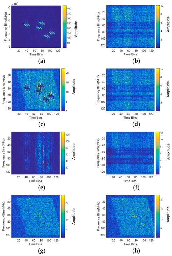 Usually, the SAR echoes are frequently interfered with by the chirp-modulated WBI. Figure 3a is the SAR echo in the range-time domain, which is the 601th pulse of the SAR data shown in Figure 1a. Meanwhile, Figure 3d is the SAR echo in the range-time domain, which is the 1069th pulse of the SAR data shown in Figure 1b. It is evident that SAR echoes are contaminated with the WBI. At the same time, WBI is time-varying, and its amplitude is significantly higher than the amplitude of the target signal. Moreover, there is a significant difference in the amplitude variation of the WBI depicted in Figure 3a,d. Figure 3b,e show the WBI in the range–frequency domain. It is obvious that the WBI possesses a greater share of frequency units within the frequency–range domain, and its amplitude is significantly stronger compared to the useful target signal. Figure 3c,f displays the time–frequency spectrogram of WBI. It is obvious that the WBI in Figure 3c is chirp-modulated. Furthermore, the WBI exhibits significantly greater strength compared to the valuable target signal. Simultaneously, the WBI in Figure 3f is composed of multiple chirp-modulated WBIs. Meanwhile, the WBI in the TFD can characterize not only its temporal and spectral features but also its time–frequency modulation and structure characteristics, which provide the foundation for further WBI mitigation.