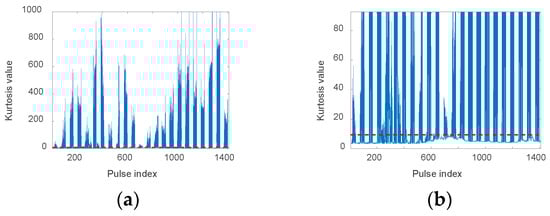 To improve the applicability of threshold selection, Meyer designed a threshold adaptive selection method based on the Neyman–Pearson criterion to enhance the RFI detection precision [34]. From Figure 4a, we can see that WBI-free SAR echoes in the TFD are Gaussian distributed, while SAR echoes corrupted with WBI have non-Gaussian characteristics. Since the statistical characteristics of SAR echo are significantly different from WBI, a Gaussian distribution parameter can be used to measure their difference, thus detecting the WBI. From the knowledge of information and statistical theory, kurtosis is usually used to measure the non-Gaussian properties of data. Figure 4a shows that in the TFD, the kurtosis of SAR echo without WBI is 5.78, while the kurtosis of SAR echo with WBI is 482.68. Zhou proposed an adaptive NBI detection method based on kurtosis [35]. Since NBI and the target signal have obvious statistical differences in TFD, the Neiman–Pearson criterion is fully used to detect NBI. However, this method is only used for NBI and is no longer suitable for WBI detection.