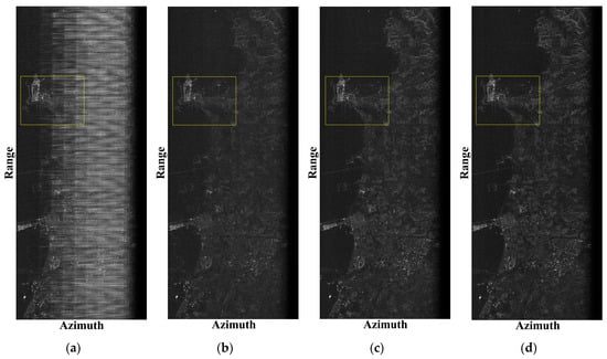 Depending on the bandwidth of the RFI, it is generally divided into two categories: interference with a limited bandwidth, known as narrowband interference (NBI); and interference with a broader bandwidth, referred to as wideband interference (WBI). Compared with NBI, WBI has a larger bandwidth. As a result, the SAR image quality corrupted by WBI is worse, and the SAR image interpretation accuracy is lower. Figure 1a,c show two WBI corrupted range-time/azimuth-time domain SAR data recorded by the sentinel-1A satellite, which uses Terrain Observation by Progressive Scans Mode (TopSAR). The red vertical lines surrounded by white ellipses in Figure 1 represent WBI. Figure 1b,d represent the corresponding two WBI-corrupted SAR data in the range–frequency azimuth-time domain. From Figure 1, it can be seen that the WBI has vital energy and high time-varying properties concerning the target echoes. Figure 2 depicts the SAR imaging results without the WBI mitigation method. It can be seen that the presence of WBI seriously obscures the information about the target in the scene, which brings significant challenges to SAR image segmentation, target detection, target identification, and other image interpretation tasks. Therefore, it is imperative to present a viable WBI mitigation algorithm to eliminate the effect caused by RFI on SAR images.