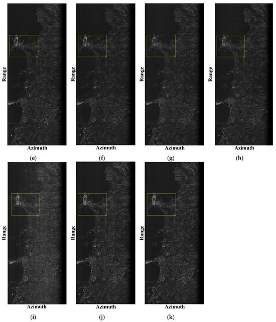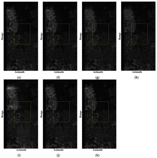 SAR imaging results (a) without WBI mitigation and after applying (b) GoDec, (c) ISNF, (d) ESP, (e) IAA, (f) MFD, (g) IMFD, (h) APMFD, (i) RPCA-TFP-JDA, (j) IMN, and (k) WBIM-GAN.