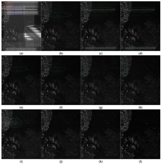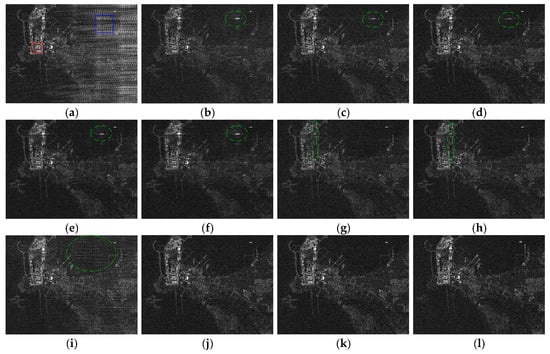 Enlarged SAR imaging results (a) without WBI mitigation and after applying (b) GoDec, (c) ISNF, (d) ESP, (e) IAA, (f) MFD, (g) IMFD, (h) APMFD, (i) RPCA-TFP-JDA, (j) IMN, and (k) WBIM-GAN. (l) WBI-free SAR image acquired in the same area.