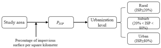 In this paper, we use the percentage of impervious surfaces to indicate different urbanization levels within the region. We first used remote sensing data to calculate the percentage of impervious surfaces (PISP) in every 1 km × 1 km grid and then used the PISP to classify the urbanization level. The following equation was used to calculate the PISP: