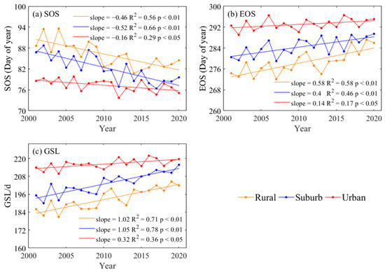 To explore the variations in vegetation phenology among urban, rural, and suburban areas, this study extracted the average values of phenology in urban, rural, and suburban areas and fitted them with a linear regression equation. The results are shown in Figure 6. From 2001 to 2020, the average SOSs were on Days 86, 82, and 77 in rural, suburban, and urban areas, respectively, all showing early trends. Rural areas advanced by an average of 0.46 days per year, and suburban areas showed the greatest change, advancing by an average of 0.52 days per year. The trend in urban areas was not obvious, with an increase of 0.16 days per year (Figure 6a). Figure 6b shows the interannual variation in the average EOSs, all of which exhibit a trend of being delayed. The average EOSs for urban, rural, and suburban areas were on Days 293, 278, and 285, respectively. The largest variation was in rural areas, with an average delay of 0.58 days per year, and the smallest variation was in urban areas, with a delay of 0.14 days per year. The change in suburban areas was between those in rural and urban areas, with a delay of 0.4 days/year. The GSLs in rural, suburban, and urban areas all tended to extend due to the advance in the SOS and the delay in the EOS (Figure 6c). The greatest variation in the GSL was observed in suburban areas, with a lengthening of 1.05 days per year and a mean GSL of 203 days. The average GSL in rural areas was 192 days, with a mean delay of 1.02 days per year. The lowest amplitude of GSL was found in urban areas, where the average prolongation was 0.32 days per year, with a mean GSL of 216 days.
