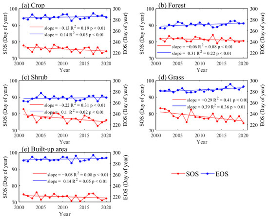 We also analyzed the variability in phenology for different land cover types, and the results are shown in Figure 7. The built-up area contains green vegetation such as green belts, so phenological parameters can also be extracted. The trends in the SOS and EOS were the same for all five types, with the SOS showing a trend of advancing and the EOS showing a trend of being delayed. The SOS advanced by 0.29 days/year (grassland), 0.13 days/year (shrub), 0.13 days/year (crop), 0.08 days/year (built-up area), and 0.06 days/year (forest). The EOS was delayed by 0.39 days/year (grassland), 0.31 days/year (forest), 0.14 days/year (crop), 0.14 days/year (built-up area), and 0.1 days/year (shrub).