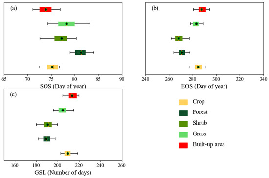 The results of the SOS, EOS, and GSL of the five land cover types (farmland, shrub, grassland, forest, and built-up area) are displayed in Figure 8. The SOS on the five land cover types began in March, with an average distribution between Day 73 and Day 82. The built-up area had the earliest onset time, with the average on Day 74. Excluding built-up areas, the earliest average start time among the four vegetation types was for agricultural land, occurring on around Day 75, followed by shrubs and grasslands, occurring on Days 77 and 78, respectively. The EOS of forests was evenly distributed on Day 81, with the latest SOS (Figure 8a). The EOS started in September, with an average distribution between Days 268 and 287. The built-up areas had the latest EOS, with the average being on Day 287. The EOS occurred later in agricultural and grassland areas on Day 284 and Day 283, respectively. The EOS of forests was evenly distributed on Day 271, and shrubs had the latest EOS, distributed on Day 268 (Figure 8b). The GSL was distributed between 190 and 215 days, with the longest time GSL occurring in built-up areas at 215 days and the shortest time GSL occurring in forested areas at 190 days (Figure 8c).