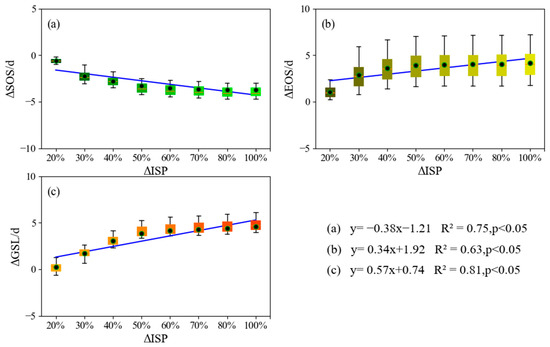 Effect of changing PISP on urbanization-level phenology. (a) shows the variation in ∆SOS with urbanization level differences. (b) shows the variation in ∆EOS with urbanization-level differences. (c) shows the variation in ∆GSL with urbanization-level differences.