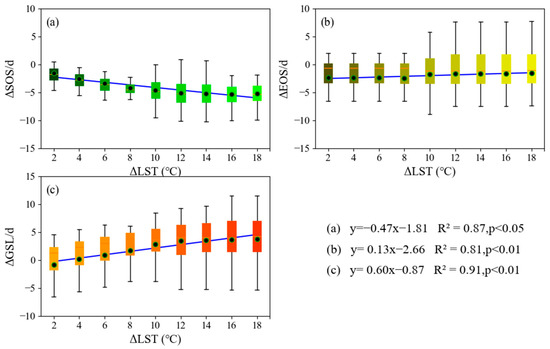 The effect of surface temperature on urbanization-level phenology. (a) shows the variation in ∆SOS with temperature differences. (b) shows the variation in ∆EOS with temperature differences. (c) shows the variation in ∆GSL with temperature differences.