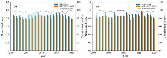 The contribution of the surface temperature increase to phenological changes. (a) shows the contribution of surface temperature to the impact of urbanization on the SOS. (b) shows the contribution of surface temperature to the impact of urbanization on the EOS.