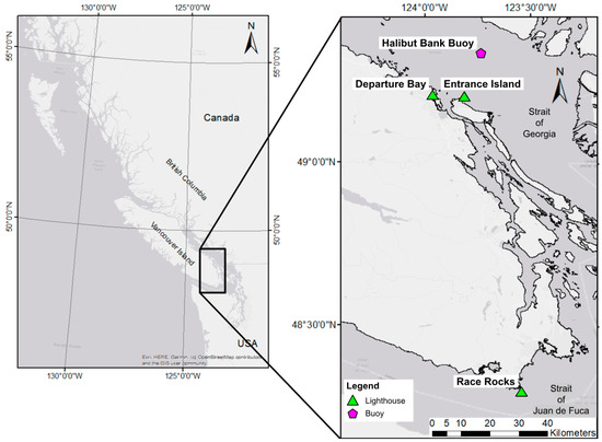 Daily mean ST measurements are recorded at lighthouse stations (British Columbia Shore Station Oceanographic Program) using the “bucket method”, whereby observations are made from seawater collected by lowering a bucket into surface waters at or near daytime high tide (6 a.m.–6 p.m. LST) [32]. Archived SST data were downloaded from the DFO data server (https://open.canada.ca/data/en/dataset/719955f2-bf8e-44f7-bc26-6bd623e82884 (accessed on 19 November 2021)). For each site, information on the location of in situ SST sampling (Figure 2) was considered based on illustrative maps provided by DFO (pers. comm., [36]) and occurs specifically as the following: