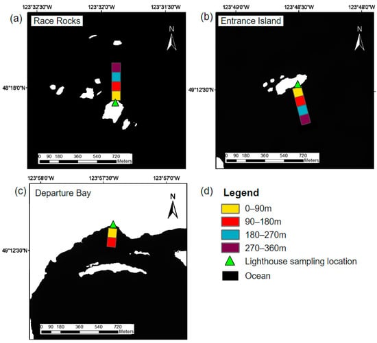 - For the three nearshore locations, a Canadian Hydrographic Service (CHS) Low Water Mark (LWM) (https://catalogue.data.gov.bc.ca/dataset/chs-low-water-mark-lines (accessed on 1 September 2021)) was used to delineate the coastline around the lighthouse locations (Figure 1). From the derived coastline, a 3 × 12 pixel transect was defined as perpendicular to the coast from the local dock where SSTin situ was collected (Figure 2). Each transect was then subdivided into four distance groups covering nine (3 × 3) pixels each: 0–90 m, 90–180 m, 180–270 m, and 270–360 m. For the Departure Bay lighthouse site, sampling was not possible past 180 m from the coast because a small island offshore from the lighthouse created a geographical constraint (Figure 2c). The mean SSTLsat value and standard deviation of each 3 × 3 pixel window were extracted for each data analysis scenario [10,41,43].