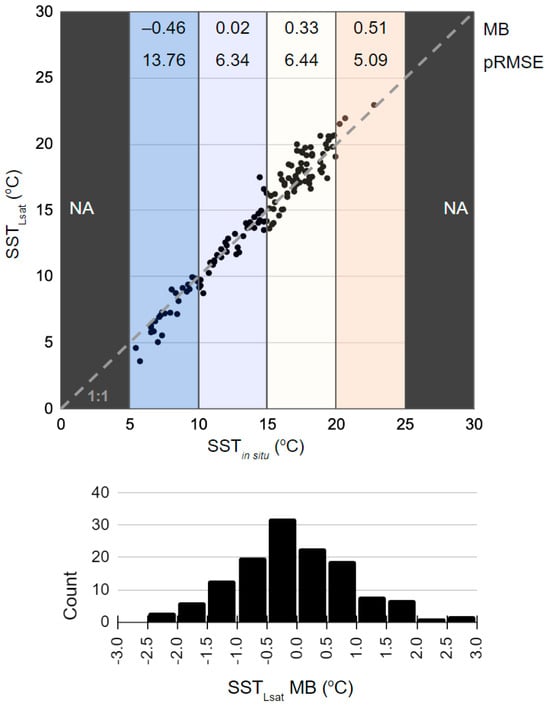 Regression plot of all farshore matchup results, including the MB (°C) and pRMSE (%) of in situ binned (5 °C) temperature groups (above). Frequency distribution of the farshore matchup SSTLsat biases (below).