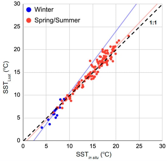 The selected images represented the surface temperature in Kelvin following the application of Landsat-defined conversion coefficients (K = DN × 0.00341802 + 149) [11]. Image values were then converted to degrees Celsius (°C = K − 273.15), hereafter called SSTLsat, for ease of comparison with the SSTin situ. Next, the images were organized according to the (1) sensor (Landsat 5, 7, and 8), (2) site overlap, and (3) season. Images were categorized into two seasons (winter = α ≤ 30° and spring/summer = α > 30°) based on the local noon solar elevation angle (α), accessed from the National Oceanic and Atmospheric Administration (NOAA)’s online Solar Geometry Calculator (https://gml.noaa.gov/grad/antuv/SolarCalc.jsp (accessed on 11 October 2021)). Under this method, 7% of usable images (23 of 351) were classified as winter, and 93% (328 of 351) were classified as spring/summer.