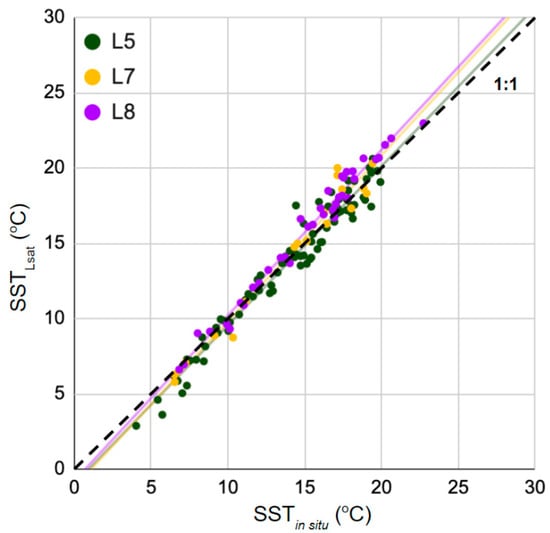 Relationship between farshore matchup Landsat and in situ SST, categorized by satellite, for all seasons, including linear trendlines.