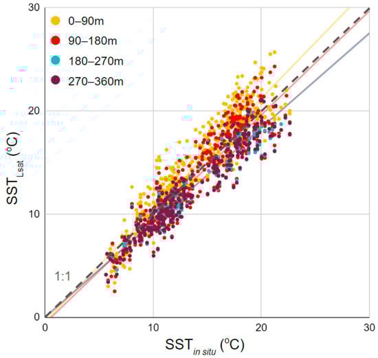 SSTLsat from all distance groups produced relatively high R2 values between 0.87 and 0.91 (Table 5). Generally, SSTLsat directly adjacent to the coast, within the 0–90 m distance group, overestimated SSTin situ by an MB (RMSE) of 0.58 °C (1.78 °C) (Figure 6, Table 5). Moving away from the coast, SSTLsat at 90–180 m was lower than SSTin situ by an MB (RMSE) of −0.61 °C (1.74 °C). SSTLsat from both 180 to 270 m and 270 to 360 m further underestimated SSTin situ by about 1.0 °C.