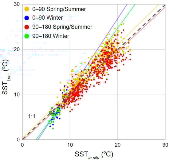 Relationship between nearshore matchups of SSTLsat and SSTin situ for the <180 m dataset, categorized by season, including linear trendlines.
