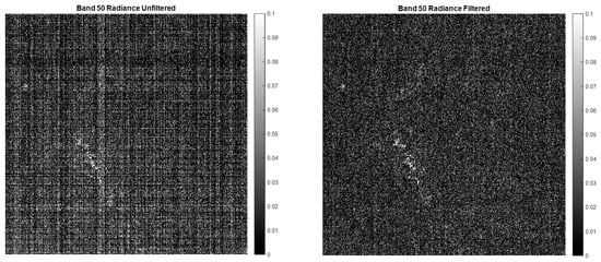 Fixed pattern noise is common in CMOS-based imaging devices such as DESIS. It is caused by amplifiers present in each column, the variation between columns, and the variation between pixels within a column. There is also row-based fixed pattern noise that is smaller than the column-based type. Unlike random noise affecting all illumination levels, fixed pattern noise creates column and row striping. It is especially visible over homogeneous land covers and most pronounced in low-light contexts. Figure 4 (left) shows representative fixed pattern noise from band 50 of the DESIS imagery over Las Vegas (Tile 3 in Table 2) before filtering. The scale extends to 0.1 W m−2 sr−1 μm−1, a very low spectral radiance level consistent with the inherent noise level of the system. While dark frame subtraction removes nearly all the offset, fixed pattern noise can be re-introduced in post-processing.