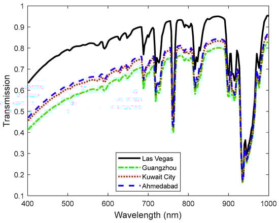Atmospheric correction to ground-leaving radiance is calculated by dividing top-of-atmosphere (TOA) spectral radiance by ground-to-space atmospheric transmission. The MODTRAN 6 radiative transport code [32] was used to calculate ground-to-space atmospheric transmission based on a mid-latitude summer atmosphere with visibility adjusted to match aerosol optical depths (AODs) as measured that day by VIIRS [33] for Las Vegas (AOD 0.07, visibility 141 km), Guangzhou (AOD 0.38, visibility 19 km), Kuwait City (AOD 0.32, visibility 24 km), and Ahmedabad (AOD 0.29, visibility 26 km). Atmospheric transmission over the 400–1000 nm spectral range using a nominal 3 nm Gaussian FWHM to approximate DESIS’s spectral resolution was calculated (Figure 5) and evaluated at the DESIS band center wavelengths.