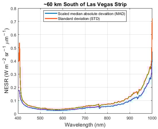 To calculate SNR, each pixel’s spectral radiance is divided by the noise equivalent spectral radiance (NESR) at each band. NESR is estimated based on a scene-level standard deviation (STD) and/or scaled median absolute deviation (MAD) [38]. The STD and scaled MAD for an assumed normal distribution are very similar for dark scenes except at the spectral extremes (e.g., near 400 nm or 1000 nm), where the scaled MAD is more predictable. Figure 6 shows an NESR estimate from a dark L1B spectral radiance scene of a largely undeveloped region ~60 km south of Las Vegas, NV (Tile 3 in Table 2), using both STD and scaled MAD approaches. The scaled MAD estimate for NESR is less influenced by outliers that occur in the least sensitive spectral regions of the instrument (such as the deep blue wavelength region), and while it could be applied to any DESIS nighttime scene, after examining multiple scenes, it was found to be relatively invariant in terms of scene location and time for dark scenes. For this investigation, a scaled MAD approach was applied to a single dark scene to determine NESR, and then it was applied to all scenes. The NTL source search spectral range was limited to 415–900 nm since the NESR grows exponentially above and below this range. The NESR shape is approximately the inverse of DESIS’s sensitivity due to detector and spectral throughput variations. The lowest NESR value occurs around 600 nm, which makes it easier to detect visible light sources.