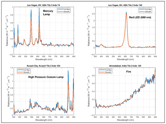 To attempt to optimize the sensor spectral resolution for different light sources, a hybrid approach was deployed that combines high-resolution 2.55 nm sampled DESIS data with a locally estimated scatterplot smoothing (LOESS) weighted regression algorithm using a second-order polynomial, with a span of 11 spectral samples or ~28 nm to smooth the spectra [35]. LOESS algorithms are flexible and can be used for narrow and broad spectral shapes. The robust iterative form of the algorithm [36] was not used since it overly attenuates narrow atomic emission lines, even though it could be useful for continuous spectra. LOESS smoothing over this 28 nm span reduces the atomic emission line peak amplitudes by only a factor of ~2, while substantially improving the quality of the spectra for continuum emissions.
