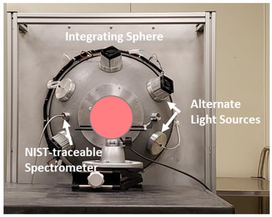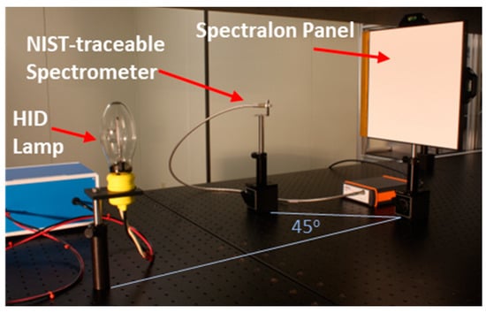HPS and MH HID lamp signatures were collected in the laboratory using a ~30 cm square SpectralonTM (Labsphere, North Sutton, NH, USA) panel. Figure 9 shows the laboratory setup for measuring the spectrum of the two HID lamps. White and red LED signatures were also collected in the laboratory, but this was carried out using a 500 mm diameter integrating sphere coated with BaSO4 paint instead. Figure 10 shows the laboratory setup used to acquire the LED spectra.