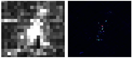 The VIIRS DNB is a well-calibrated instrument capable of measuring accurate measurements of low-light radiances [39,40]. Figure 12 shows the single band (500–900 nm) monochrome VIIRS DNB [41] image and a DESIS RGB (650, 550, 450 nm) orthorectified L1C product over the Las Vegas strip, NV. Both images were acquired on 21 April 2023. The generated VIIRS Black Marble product used in this comparison is the at-sensor TOA nighttime radiance daily Level 3 product (VNP46A1), which was downloaded from NASA’s Earthdata portal (https://search.earthdata.nasa.gov/search, accessed on 28 February 2024).
