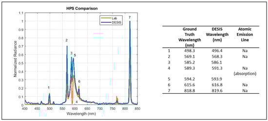 Comparison of DESIS and ground truth spectra of an HPS lamp taken in the lab using the setup shown in Figure 9. Ground-truth-measured wavelengths associated with atomic emission lines closely compare with those measured by DESIS. Includes copyrighted material of Teledyne Brown Engineering, Inc. All rights reserved. Ground truth data is included in the supplemental data as Table S1.