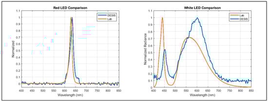 Comparison of DESIS and ground truth spectra taken in the lab for red LED (left) and white LED (right) lamps using the setup shown in Figure 10. While it is clear from the comparison that red and white LEDs are being imaged from DESIS, LED lamp spectra can vary significantly. Includes copyrighted material of Teledyne Brown Engineering, Inc. All rights reserved. Ground truth data is included in the supplemental data as Table S3.