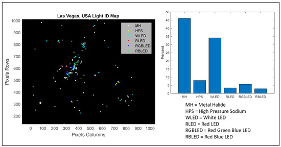 Las Vegas, NV, light identification map shown as an L1B image (left) and bar graph of scene percentages of each light type (right). In this example, MH and white LEDs dominate the NTLs observed within the scene. Includes copyrighted material of Teledyne Brown Engineering, Inc. All rights reserved.