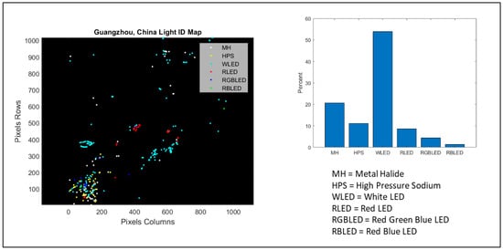 Guangzhou, China, light identification map shown as an L1B image (left) and bar graph of scene percentages of each light type (right). In this example, white LEDs dominate the NTLs observed within the scene. Includes copyrighted material of Teledyne Brown Engineering, Inc. All rights reserved.