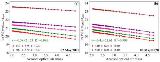 The Lunar-Langley plots with ROLO model of Cimel#1662 performed in Lanzhou, China, on (a) 2 May and (b) 3 May 2020. The optimal least square linear fitting equation and correlation coefficient (R2) at 500 nm wavelength are displayed. The subscript ‘atm’ in Y-axis denotes the optical depth of Rayleigh scattering for air molecules.