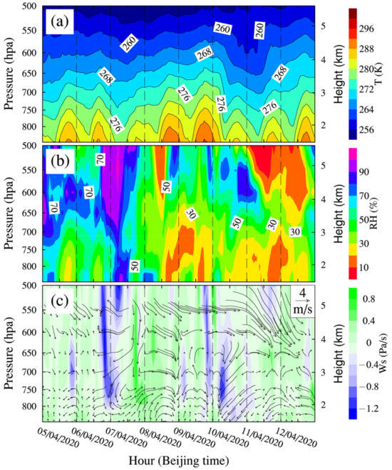 Spatial and temporal distributions of diverse meteorological element fields obtained from hourly mean ERA5 reanalysis data. (a) Air temperature (T) in K, (b) relative humidity (RH) in %, and (c) horizontal wind vector in m/s (black arrows) and vertical wind speed in Pa/s (Ws, color bars) from 5 to 12 April 2020.