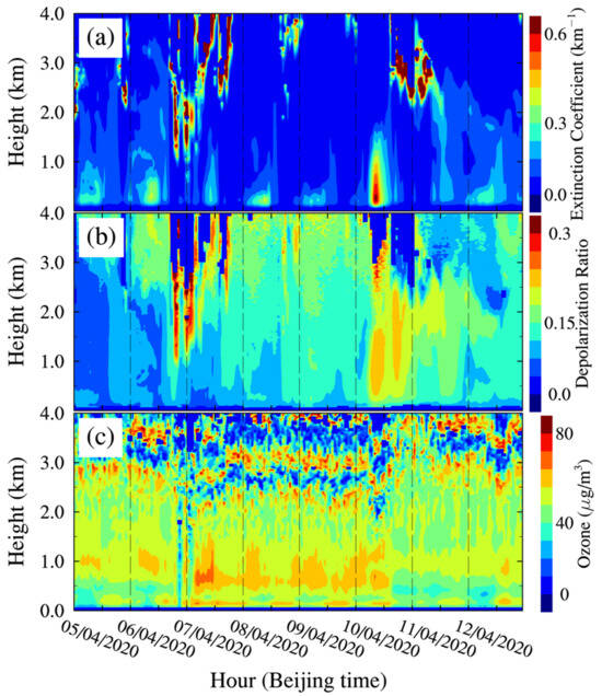 As mentioned above, Lanzhou is an important dust aerosol transport route and is often affected by dust storms every spring season. The ground-based DIAL lidar also successfully detected two strong dust events from 5 to 12 April 2020 appeared over Lanzhou. The first event occurred between 12:00 (local time) on April 6 and 20:00 on 7 April 2020, and the second dust intrusion appeared between 08:00 on 10 April and 13:00 on 11 April 2020, which corresponded well to the passing two cold fronts. Figure 3 illustrates the temporal evolution of vertical profiles of aerosol extinction coefficient, volumetric depolarization ratio, and ozone concentration derived from ozone lidar at Lanzhou during the period. We could see that aerosol extinction coefficients (σ) kept relatively low values (0.05~0.30 km−1) below 1 km height during 00:00–12:00 on 6 April, and there was an intense mixed layer of dust and clouds hanging over at 1.0–4.0 km from 12:00 on 6 April to 20:00 on 7 April, with σ values varying from 0.30 to 0.90 km−1, which was regarded as the transported dust particles from the remote desert regions. And the corresponding VDR changed from 0.03 to 0.10 below 1 km height before the first dust event, implying the dominated by fine-mode spherical particles, whereas the VDR values ranged from 0.15 to 0.55 at 1.0–4.0 km during the invasion of dust event, suggesting that the coarse-mode and non-spherical particles were predominant. Refs. [14,29] also indicated that the VDR was generally greater than 0.15 when dust events took place in Beijing and Lanzhou. There were some discrete and discontinuous signals of σ and VDR at 2.0–4.0 km, attributed to the influences of cloud layers, which were rejected after implementing quality control scheme. And the σ returned to background levels of 0.0~0.3 km−1 during the non-dusty days from 20:00 on 7 April to 06:00 on 10 April and the aerosol pollutants mainly accumulated below 500 m height, with the corresponding VDR of 0.03~0.12. However, there was an apparent layer of irregular aerosol particle continuously suspending at an altitude of 2.0–4.0 km with VDR of 0.15~0.22 during the non-dusty period where the vertical profiles of σ values stayed at a low level. Afterwards another intense dust layer occurred at 200 m to 4.0 km height from 08:00 on 10 April to 13:00 on 11 April 2020, with σ and VDR values of 0.4~1.5 km−1 and 0.15~0.30, respectively. The transregional dust aerosols were obviously transported from high altitude (~4.0 km) to the surface detected by DIAL lidar, which would seriously affect the air pollutions in both upper atmospheric layer and near the ground.