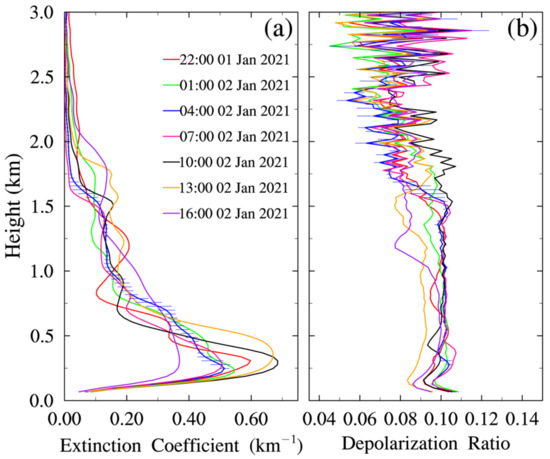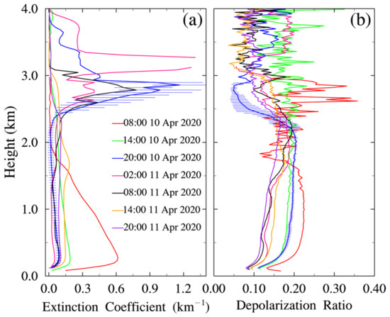 Vertical profiles of (a) aerosol extinction coefficient (km−1) and (b) depolarization ratio at different hours during the invasion of a heavy dust event from 10 to 11 April 2020. Two distinct dust layers appear at 300 m and 2.5–3.0 km heights on 10 April 2020, respectively. The error bars represent the hourly average values plus or minus one standard deviation.