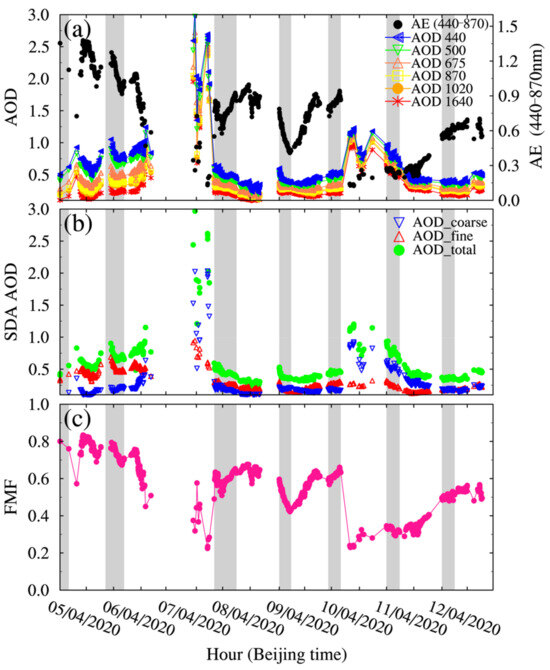 Time series of (a) spectral aerosol optical depth (AOD) at diverse wavelengths vs. Ångström exponent (440–870 nm), (b) spectral deconvolution algorithm (SDA) calculated coarse-mode (blue), fine-mode (red) and total (green) AOD at 500 nm, and (c) SDA fine-mode fraction (FMF) at Lanzhou from 5 to 12 April 2020. The gray backdrop indicates the nighttime observations from CE318-T sun-sky-lunar photometer.