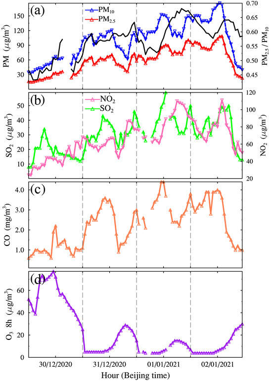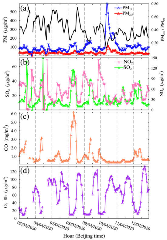 Time evolutions of hourly mean mass concentrations of six different air pollutants at Lanzhou derived from China National Environmental Monitoring Center (CNEMC). (a) PM10 and PM2.5 in μg/m3 vs. the ratio of PM2.5/PM10 (black curve), (b) SO2 vs. NO2 in μg/m3, (c) CO in mg/m3, and (d) 8 h mean of O3 in μg/m3 from 5 April to 12 April 2020.