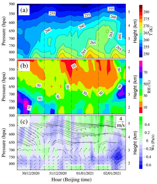 Figure 7 is the same as Figure 2, except that the dates are from 30 December 2020 to 2 January 2021. The stratified structure of air temperature field from the surface (~850 hPa) to 5.5 km (~500 hPa) height still existed during the winter cases, but the diurnal variation of T from 0 to 2.5 km was relatively weak, with the highest T (~275 K) occurring at 15:00 on 1 January 2021, which was clearly lower than that on 8 April 2020 (~292 K). This was majorly due to the significantly weaker solar radiation intensity and shorter sunshine duration reaching the surface during winter period. The RH field showed that the upper layer (3~5.5 km) was overwhelmingly dominated by very dry and cold air masses (RH of 10~30%) during the whole period, while the lower layer (0~3.0 km) was dominated by weakly warm and humid air masses (RH of 30~70%). The RH value at nighttime (50~70%) was slightly higher than that in daytime (30~40%), which was opposite to diurnal variation of T and could be explained by the classical Clausius-Clapeyron equation. The wind vector field in upper layer (500~700 hPa) presented strong and stable westerlies with wind speeds greater than 12 m/s, while the lower layer (0~3.0 km) displayed irregular wind direction and very weak wind speed (<1.0 m/s). This intense calm and stable atmosphere inversion layer were very conducive to the widespread accumulation of low-level air pollutants and deteriorated the local ambient air quality. The calm and stable weather processes lasted until 12:00 on 2 January 2021, and a strong northeasterly wind (3~6 m/s) and a moderate vertical ascending convective movement (−0.6 Pa/s) began to appear in Lanzhou since 13:00, which would greatly strengthen the dilution and diffusion capacity of surface air pollutants. An interesting phenomenon was that the upper layer air masses exhibited a distinct subsiding motion during 00:00–12:00 on 30 December 2020 and there was a strong cold and moist Tongue extending from 3.0 km to the surface, with T of 255~260 K and RH of 60~90%.