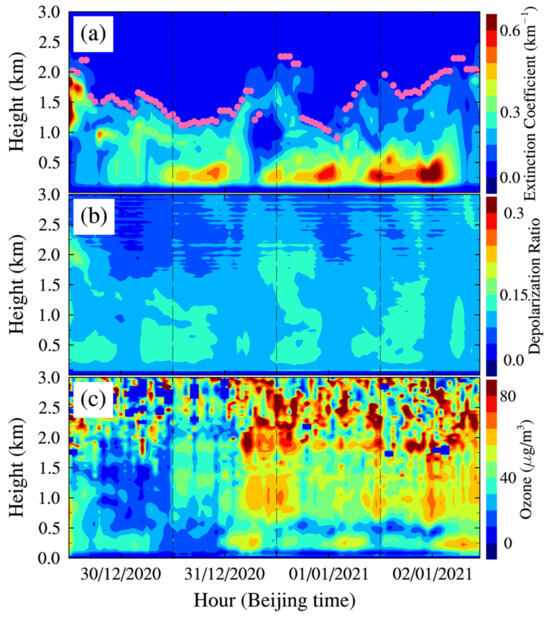 In contrast, the profile of ozone concentration exhibited a distinct two-layer structure, with the first layer at 0.60–1.40 km height and the second layer at 0.10–0.30 km. A discernible characteristic was that the highest O3 concentration of the first ozone layer generally appeared between 20:00–02:00 at nighttime, with a maximum of 72 μg/m3, while the second layer commonly occurred between 14:00–16:00 at daytime, with a maximum of 60 μg/m3. This suggested that the formation mechanism and process of ozone at diverse altitudes were different in Lanzhou, which was worth investigating in the future study. And there was also a distinct ozone layer of high O3 concentration at the altitude of 0.10–1.0 km from 00:00 to 03:00 on 30 December 2020.