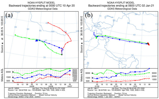 The NOAA HYSPLIT Model simulated the 72 h backward trajectories at 500 m (red), 1500 m (blue) and 3000 m (green) above ground level reaching Lanzhou at (a) UTC 00 on 10 April 2020 and (b) UTC 06 on 2 January 2021. The altitude of each back-trajectory as a function of time is also reported. The five-pointed star represents Lanzhou site.