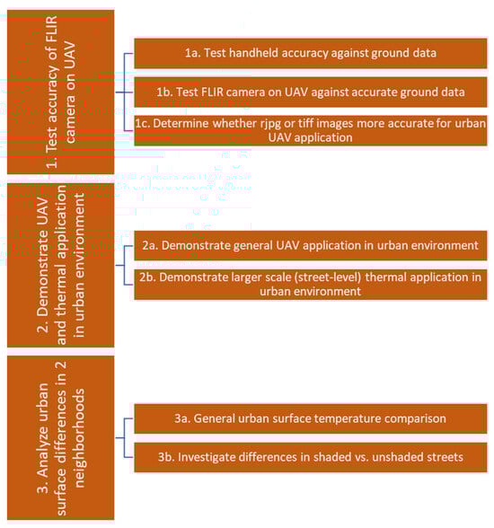 The main 3 objectives related to UAV and thermal urban surface analysis, with technical objectives listed under each.