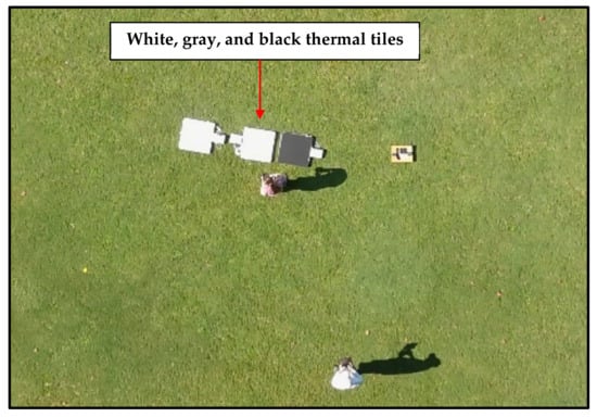 The total materials included three thermal tiles, a 13 mm FLIR Vue Pro R 640 thermal camera (FLIR, Middletown, NY, USA), a handheld FLIR E6-XT infrared imaging camera (FLIR, Middletown, NY, USA), and an Autel Robotics EVO II Dual (Autel Robotics, Bothwell, WA, USA). The three thermal tiles were each composed of a 60 cm by 60 cm aluminum sheet, each 2.2 cm thick. Four thin-film platinum resistance temperature detectors (RTDs) with three conductors were affixed underneath the tiles to give accurate temperature readings (these sensors are classified as type A with an accuracy of ±0.15 °C), which were recorded on an SD card every few seconds. To avoid heat interference from the ground, the tiles were elevated above the ground via a PVC pipe frame, and a 25 mm layer of expanded polystyrene insulation foam rested between the PVC pipe frame and the aluminum plate (with the four sensors in between the foam and plate). Each tile was painted with a matte paint in either white, gray, or black to account for different absorptive properties. Additional details on the tile construction process can be found in Lacerda et al. (2022) [22]. To collect other ground-truth temperature data, the FLIR E6-XT handheld was set to record two images simultaneously: both the thermal image in the rjpg file format and the standard RGB image, which would aid in surface type interpretation alongside the thermal image. A table of specifications for both thermal cameras is in Table 1.