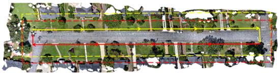 Flight lines from one sampled street on top of the stitched RGB image from the EVO camera. Flight lines followed parallel to the street, in between the road and properties. The star represents the takeoff and landing pad. The height level chosen was a balance between the best results for thermal data and at least 80% overlap.