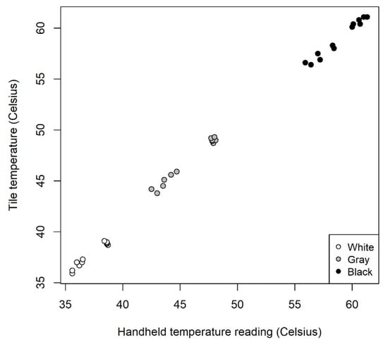 Handheld readings vs. tile temperature values (Celsius) (n = 36).