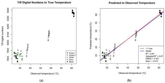(a) Raw tiff digital numbers compared with observed ground temperature (°C), revealing a spread in digital numbers despite similar ground temperatures. (b) Linear regression model predictions compared with observed ground temperature (°C).